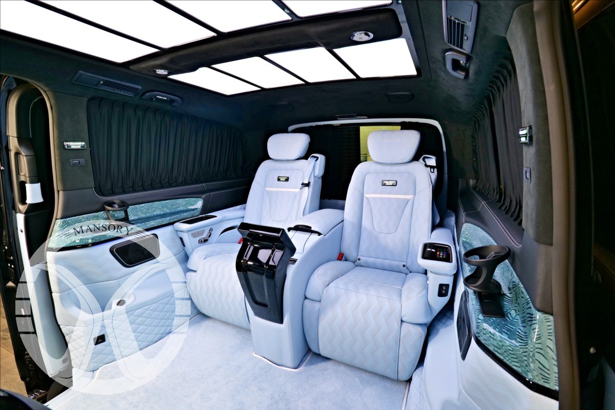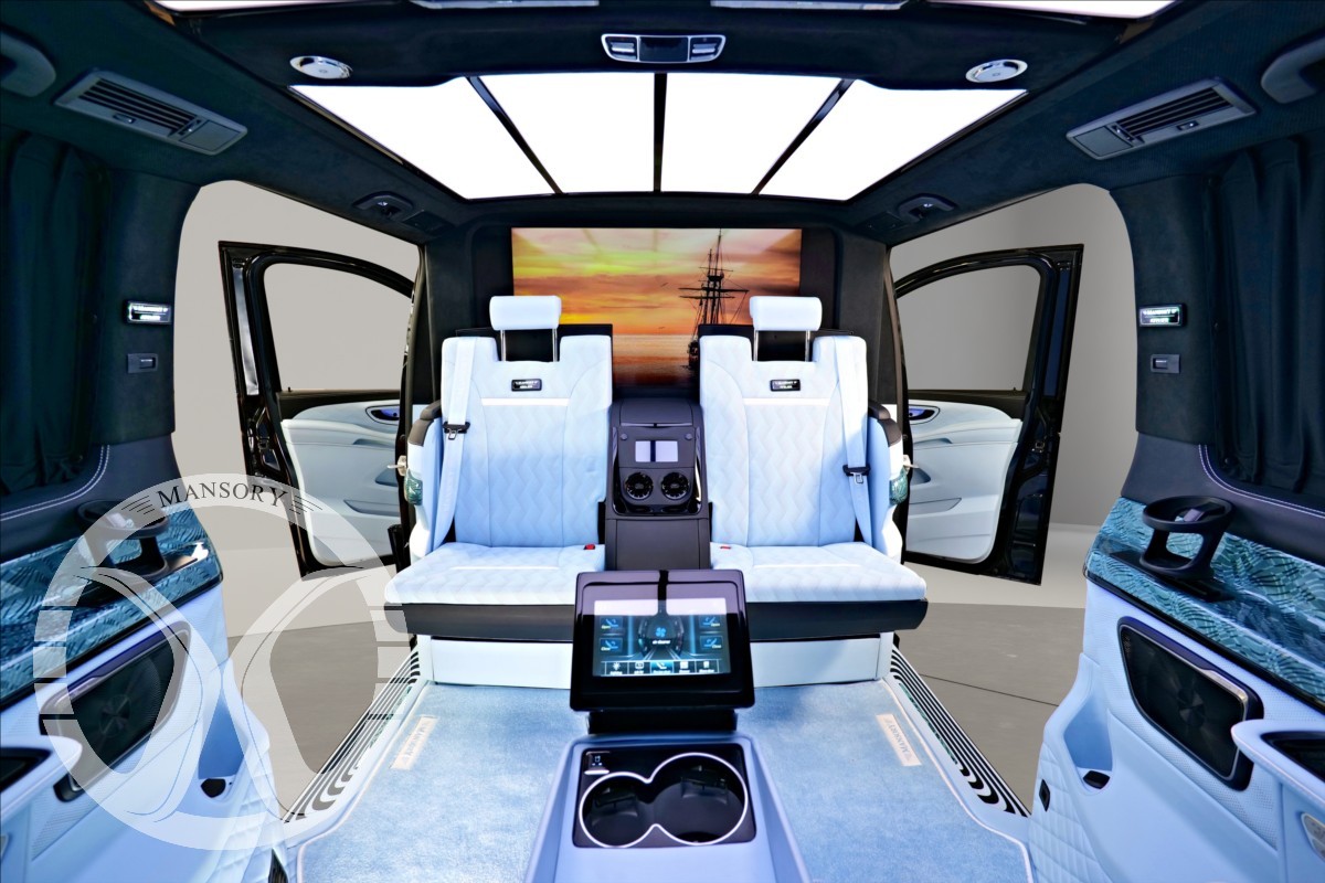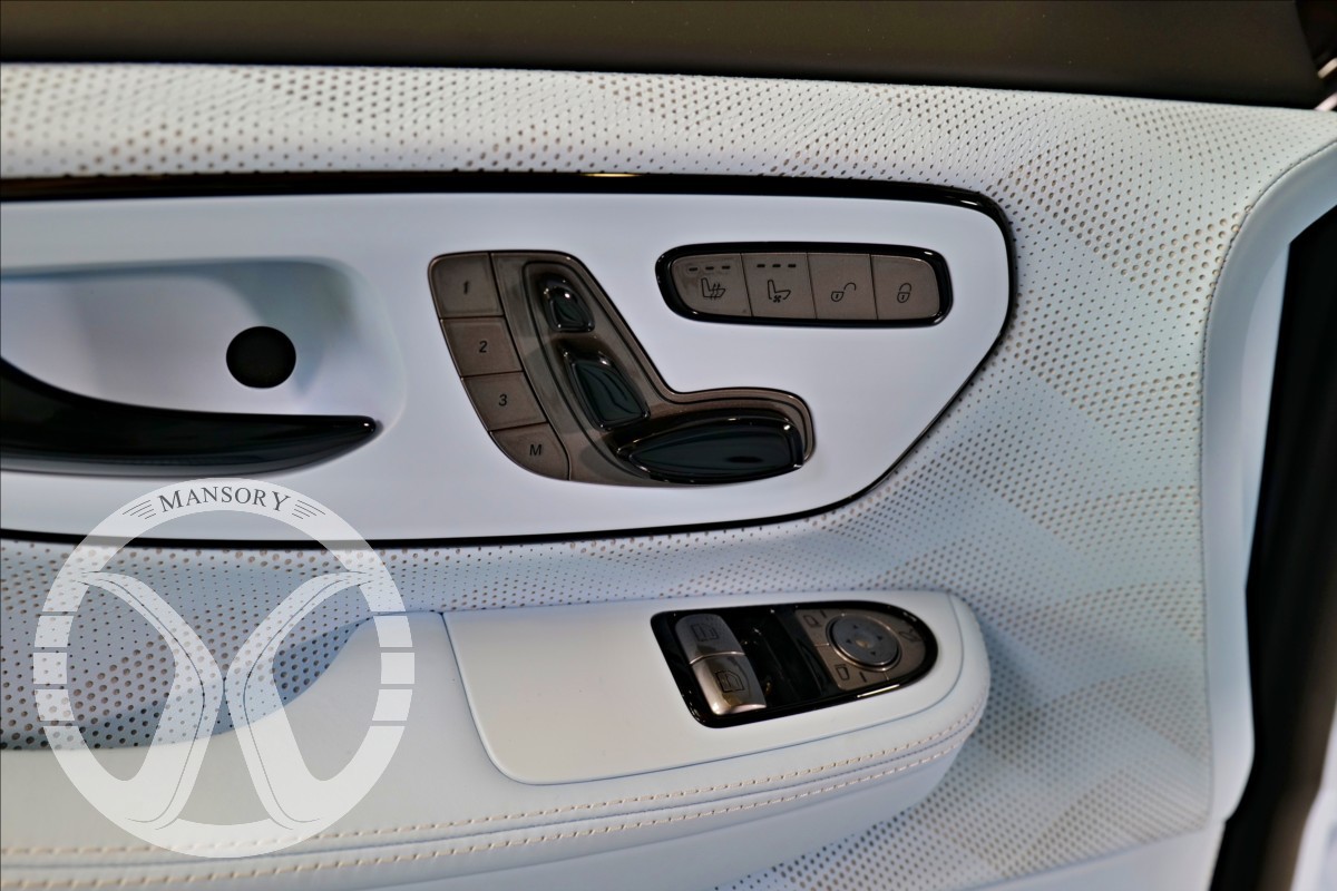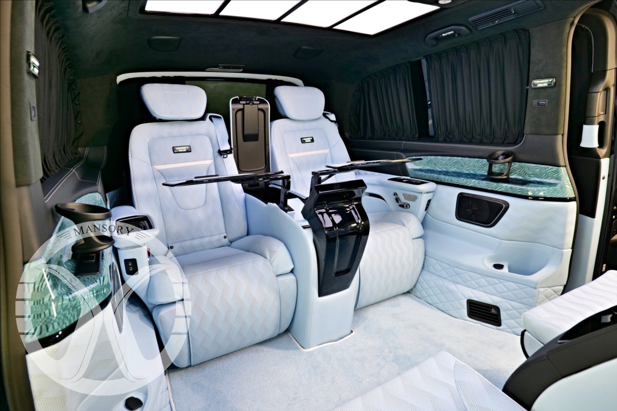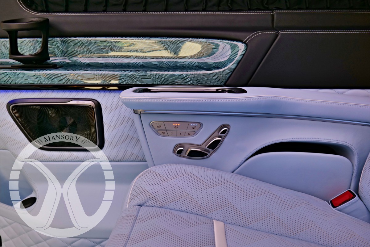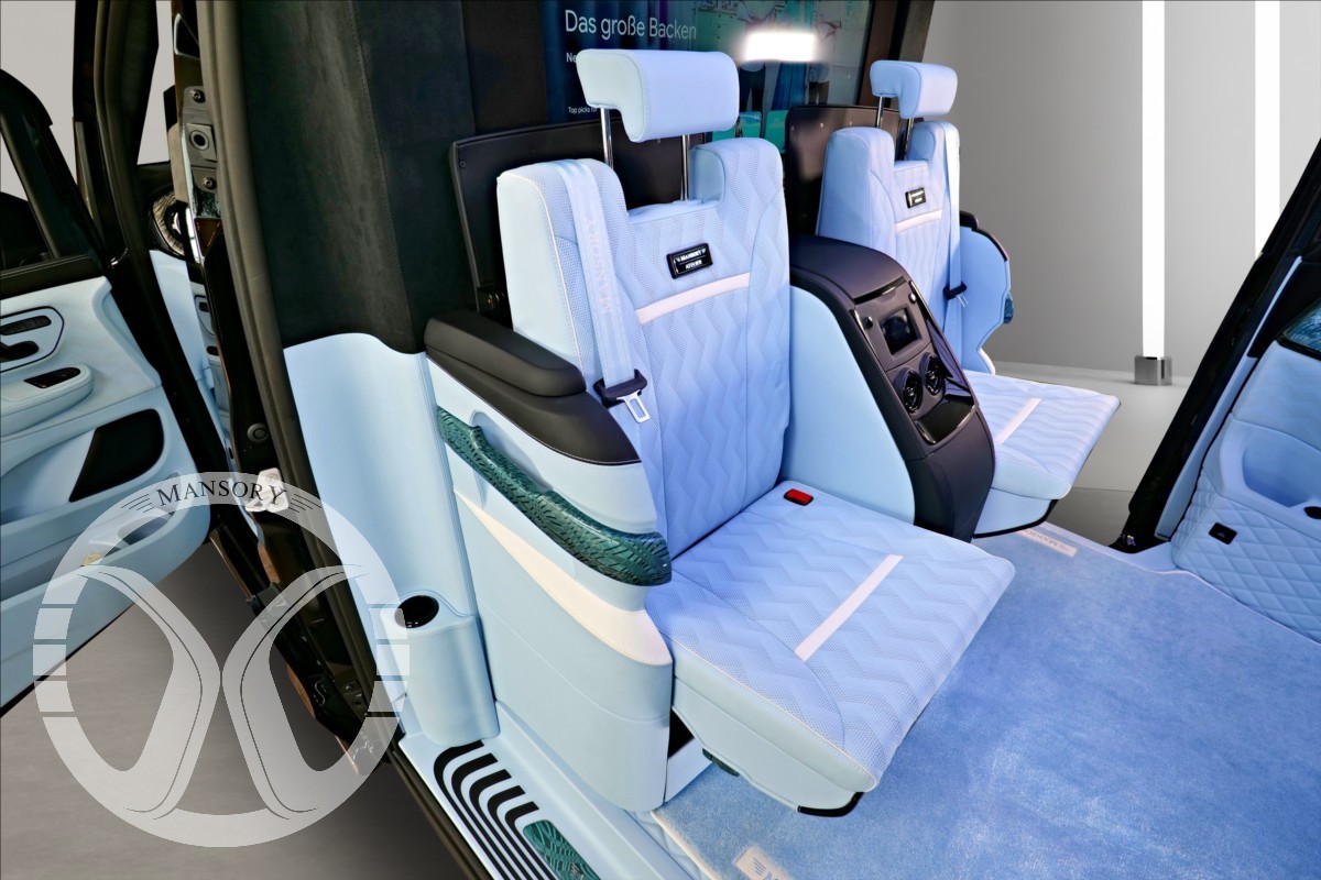 sedadla jsou upravena ve světle modrém koženém provedení v provedení VIP Class. Vozidlo je vybaveno 19' ALU disky Mansory. Další prvky vozidla jsou: vzduchové odpružení