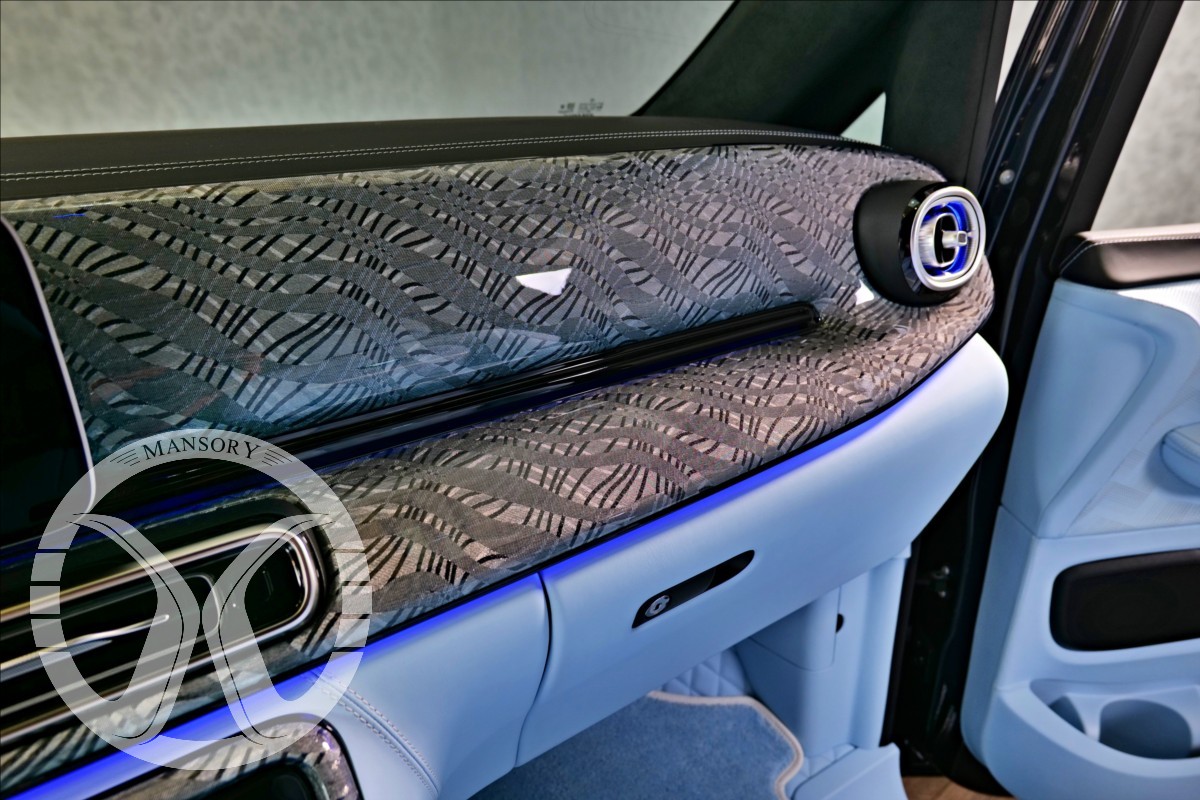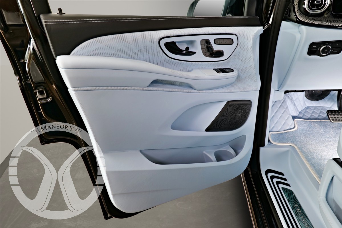 sedadla jsou upravena ve světle modrém koženém provedení v provedení VIP Class. Vozidlo je vybaveno 19' ALU disky Mansory.