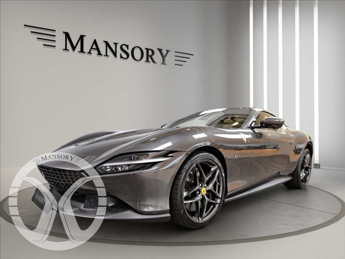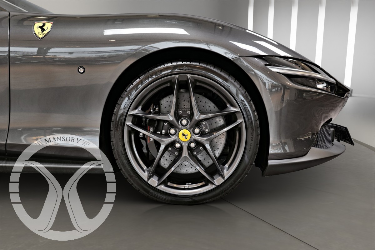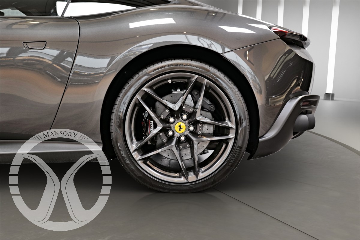 nabízíme Vám k prodeji Ferrari Roma lakované v šedé metalické barvě - Ferrari historical colours - Canna di Fucile. Interiér vozidla je v černém koženém provedení.