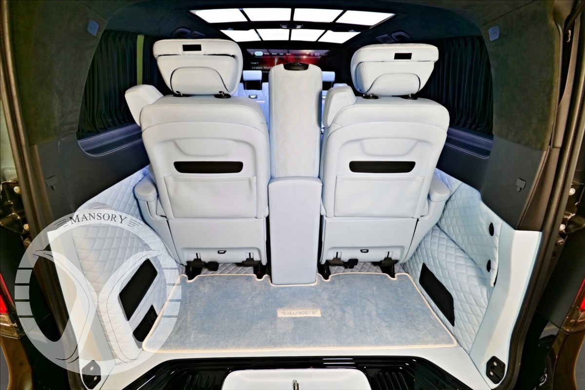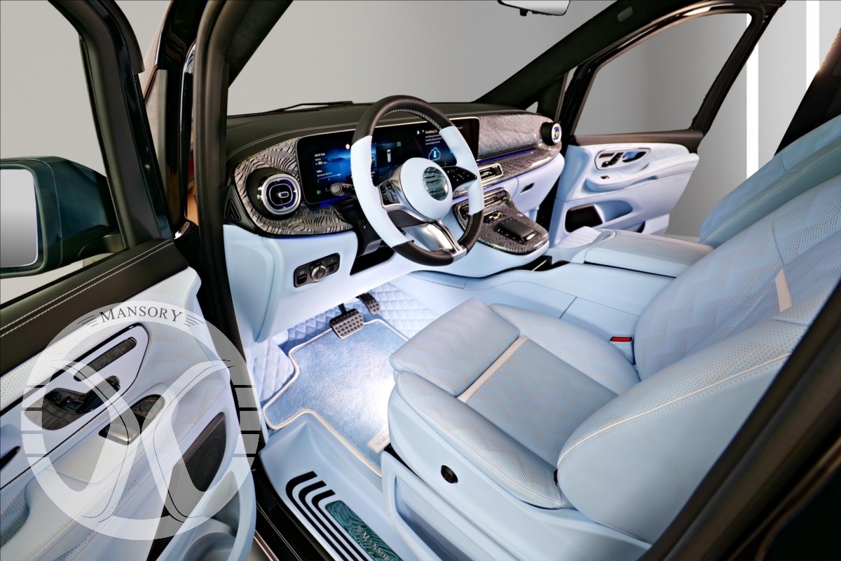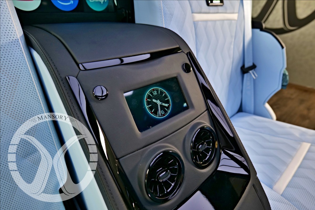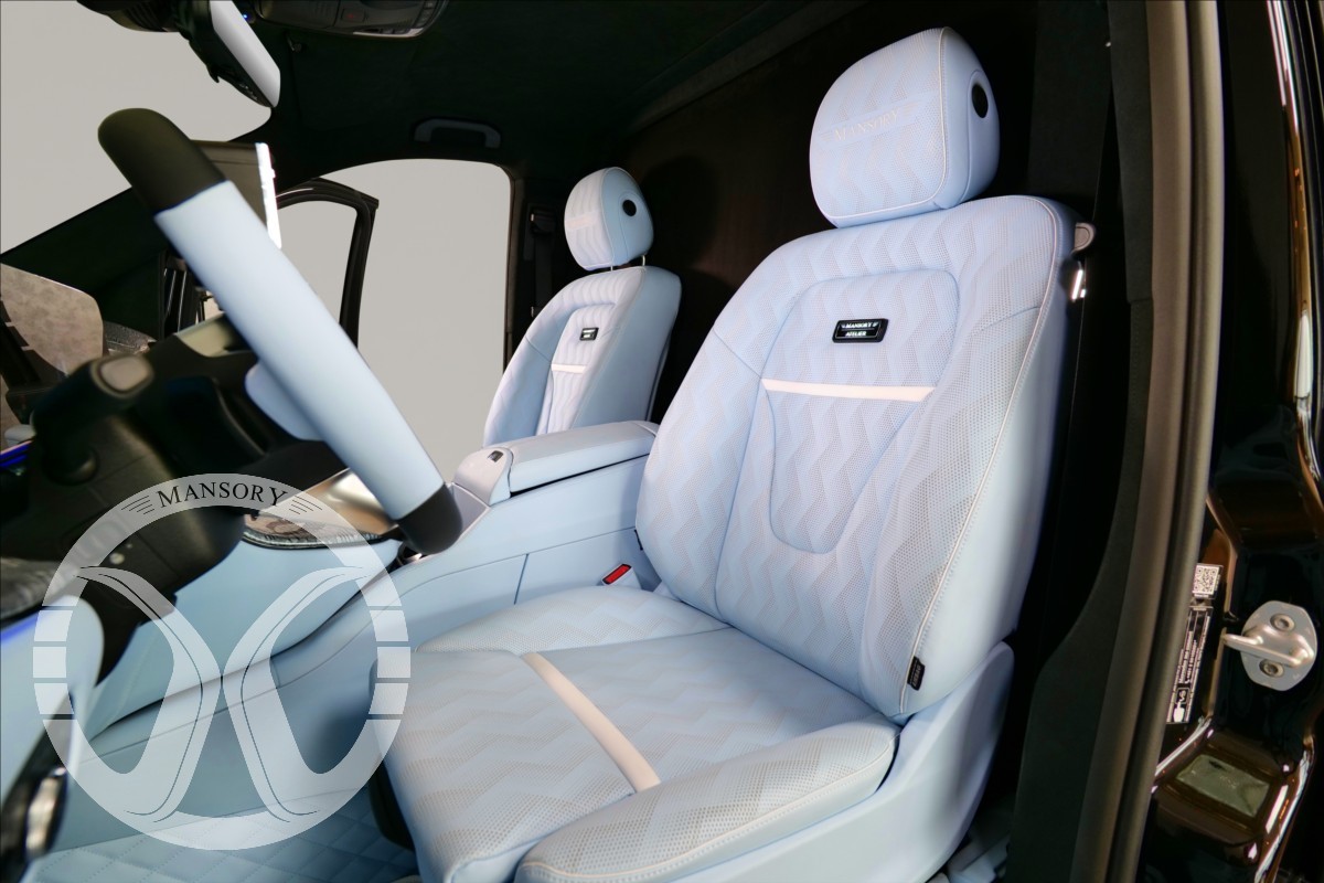sedadla jsou upravena ve světle modrém koženém provedení v provedení VIP Class. Vozidlo je vybaveno 19' ALU disky Mansory. Další prvky vozidla jsou: vzduchové odpružení