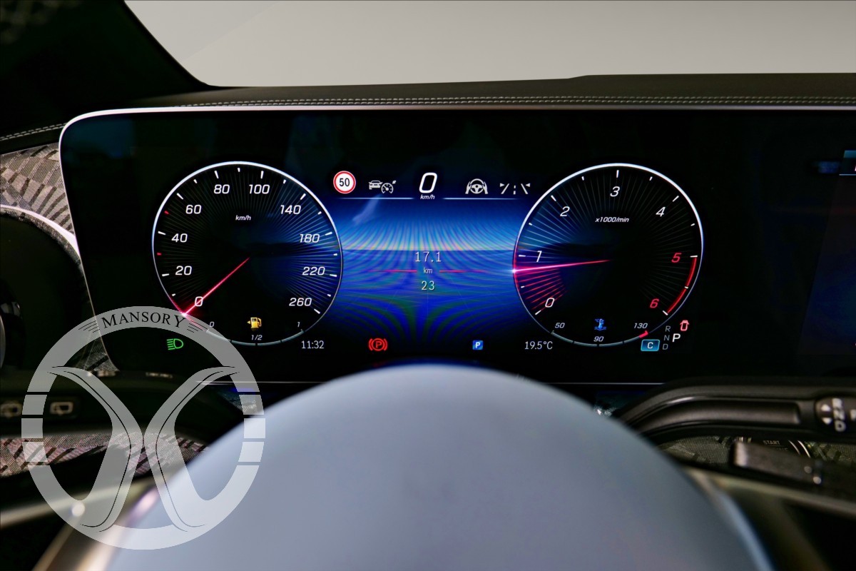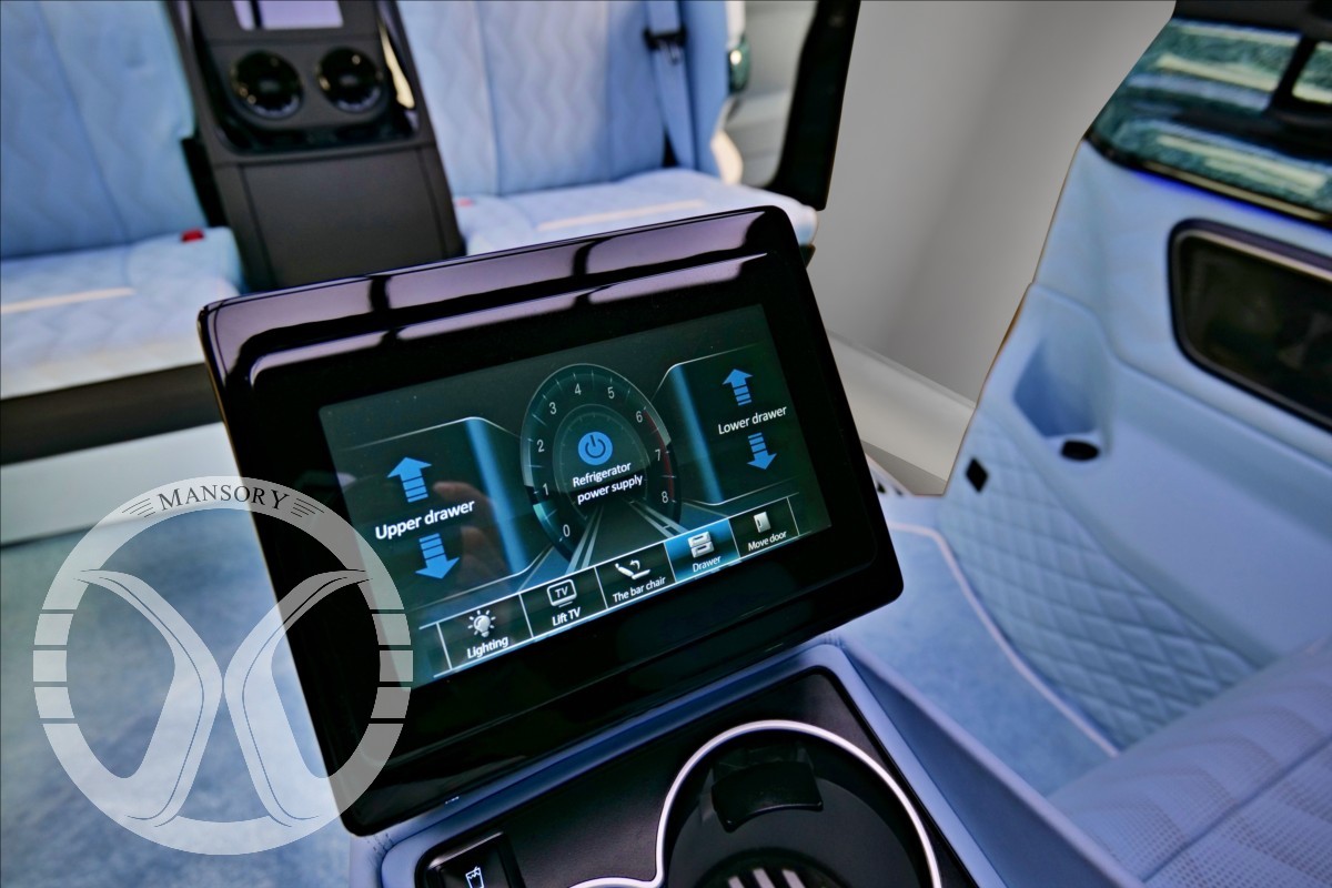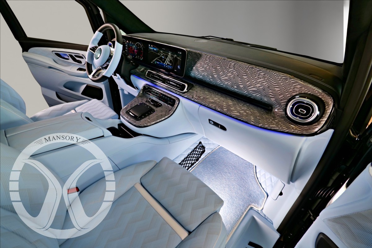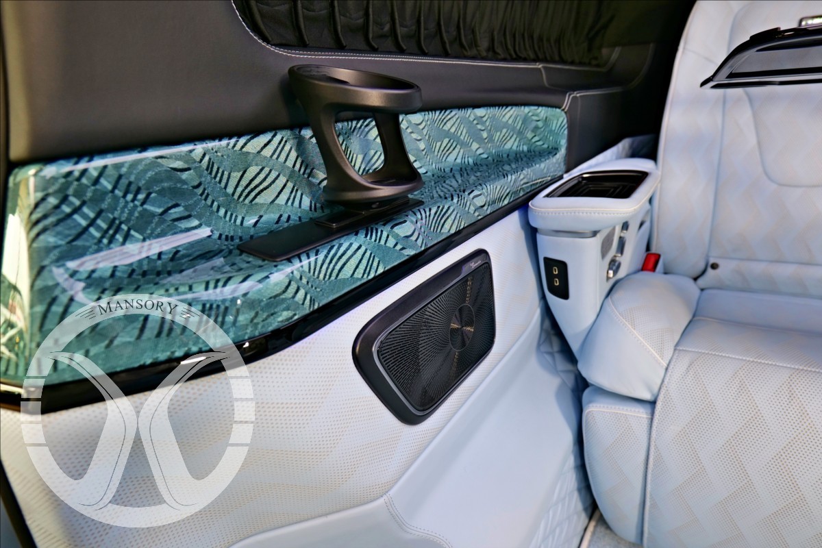 sedadla jsou upravena ve světle modrém koženém provedení v provedení VIP Class. Vozidlo je vybaveno 19' ALU disky Mansory. Další prvky vozidla jsou: vzduchové odpružení