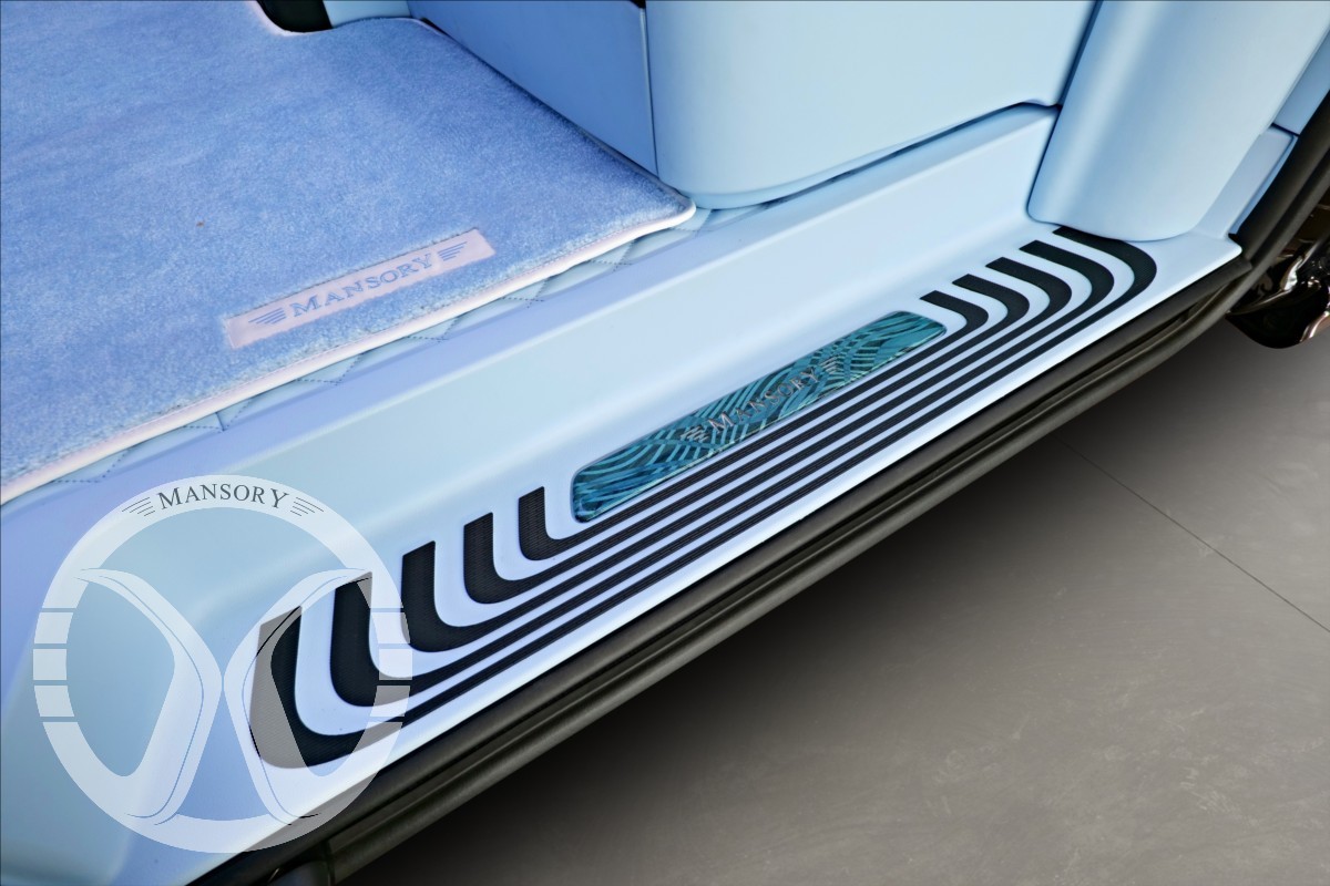 sedadla jsou upravena ve světle modrém koženém provedení v provedení VIP Class. Vozidlo je vybaveno 19' ALU disky Mansory.
